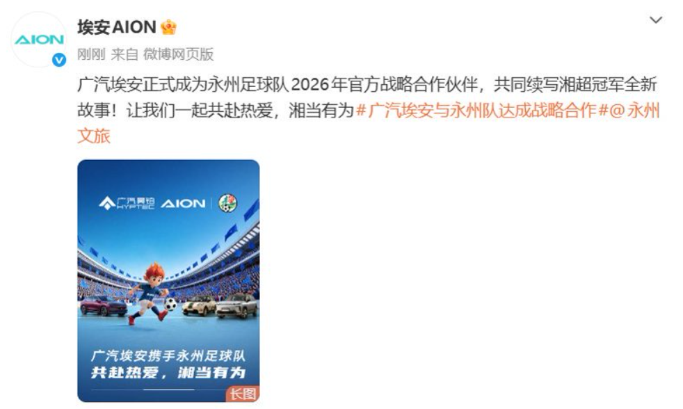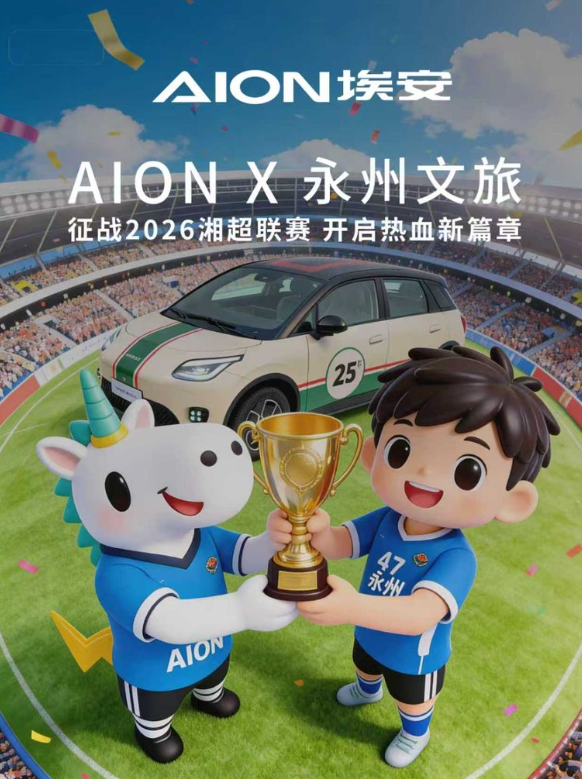 当广汽埃安的标志与湘超冠军永州队队徽同框的一刻,一场超越商业符号的合作,在2026年之初写下了充满力量的序章。