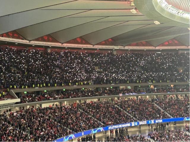 今年1月的国王杯马德里德比战前,马竞球迷就曾在大都会球场外制造“焰火墙”迎接球队的关键之战,本场对阵国米之前同样如此,去往球场的路上红色焰火随处可见,烟雾弥漫的阵势更能显现大战前夕的火药味。现场的国米球迷也有不少,他们在客场看台一度和南看台的马竞球迷形成隔空对唱的阵势。而马竞球迷的气势更足,全场球迷赛前集体举起围巾高唱队歌,在主场球迷营造出的氛围下,马竞在刚开场阶段就攻击性十足,前场的压迫让国米一度无所适从。虽然马竞很难从中路敲开国米的壁垒,但利诺和略伦特等人开场阶段在边路的攻势很凶,也迫使国米门将佐默做出扑救。